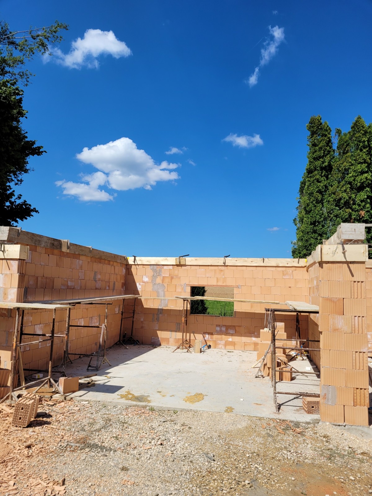 Mise en œuvre de la dalle en béton suivi du montage des murs en briques terre-cuite