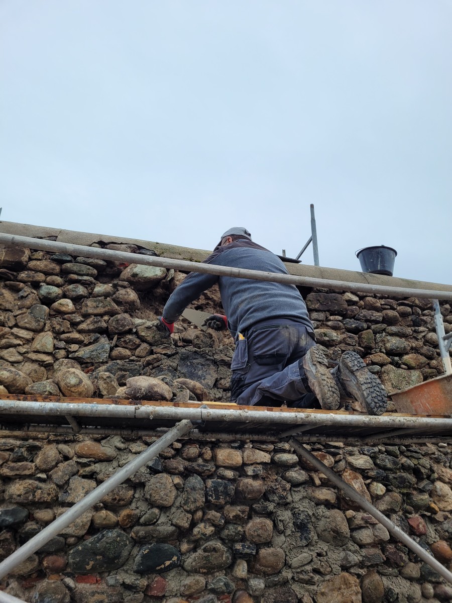 Rénovation de façade Piquage de l'ancien crépis Crépissage au mortier de chaux avec pierre apparente