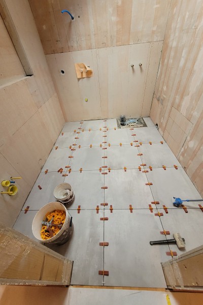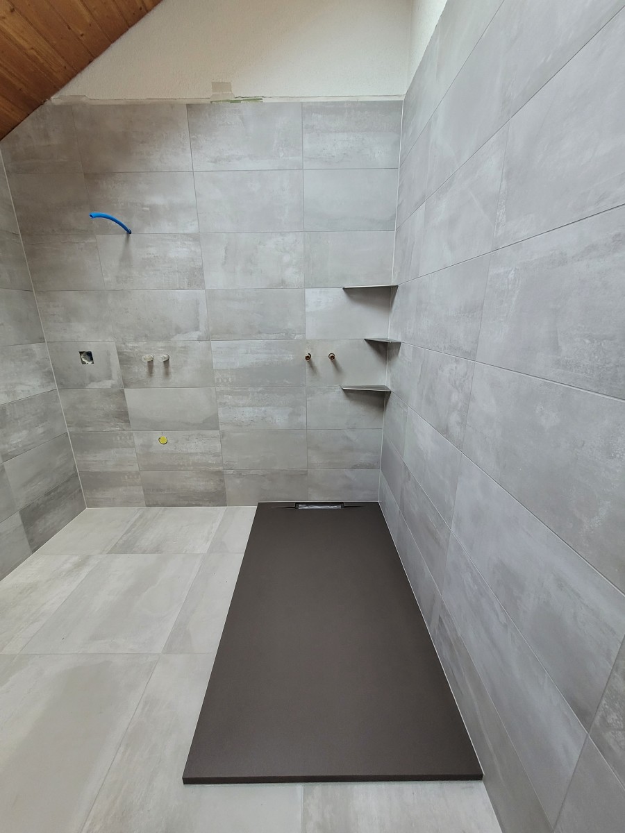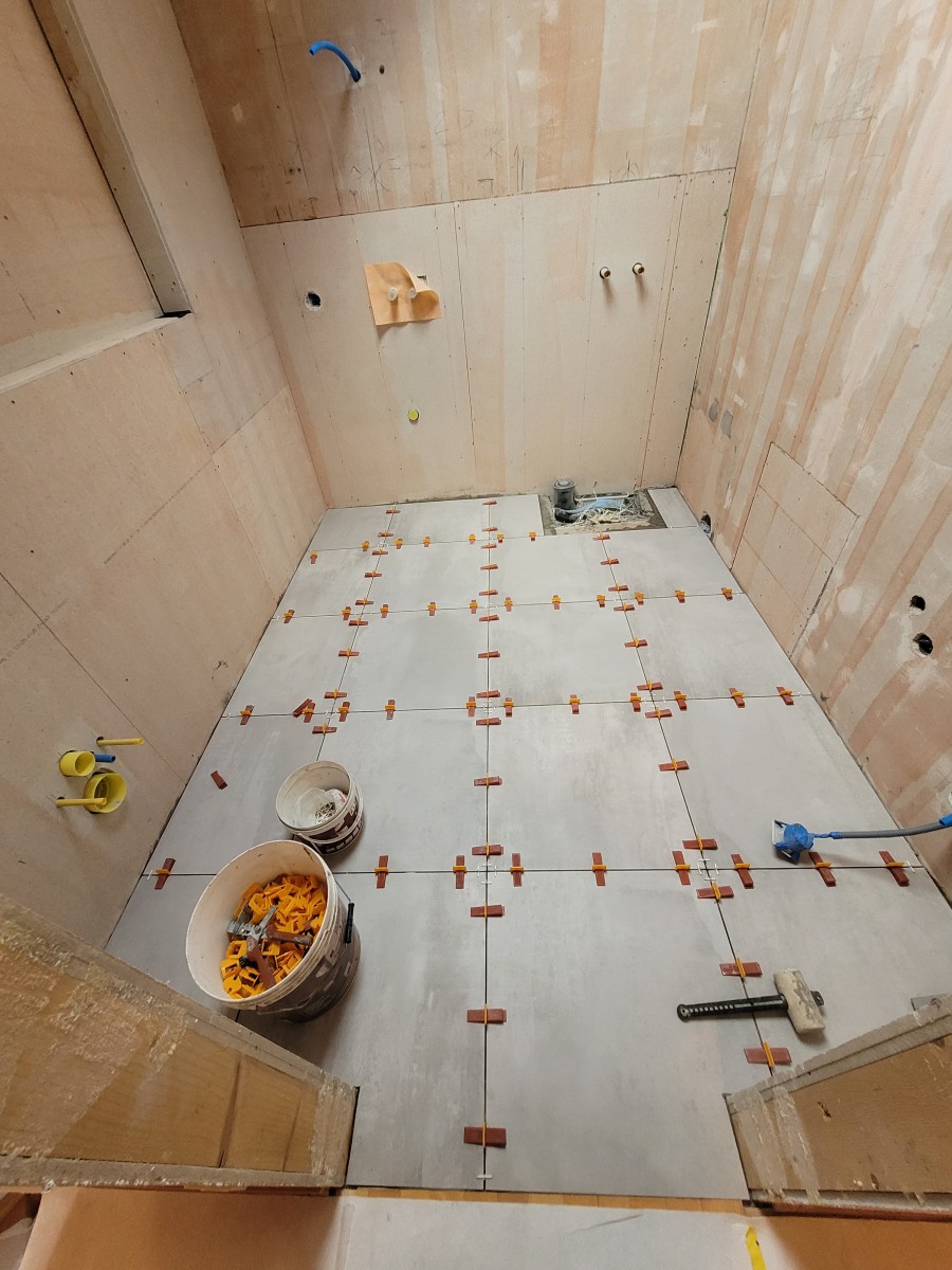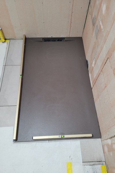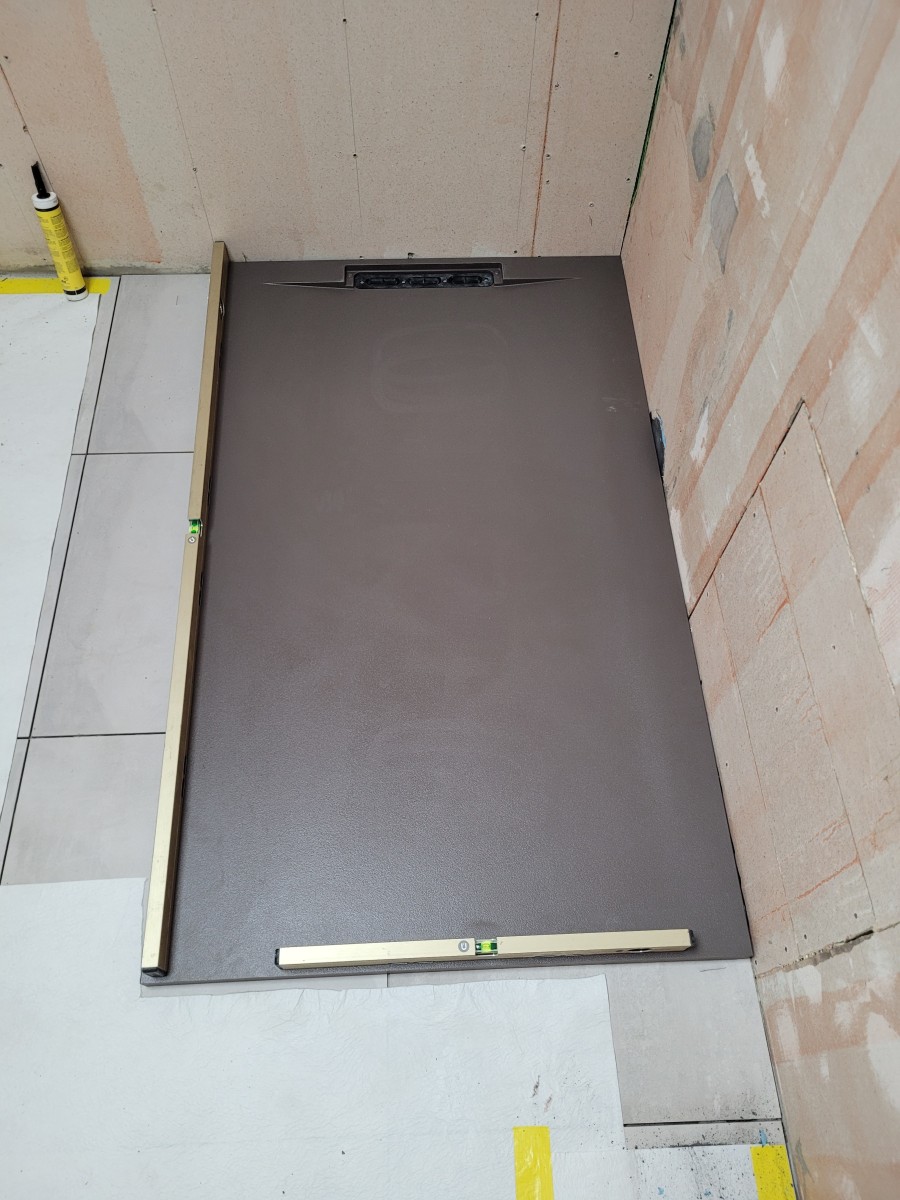 La pose du carrelage au sol de 60/60 a été réalisée, le sanitaire a pu poser le bac de douche.