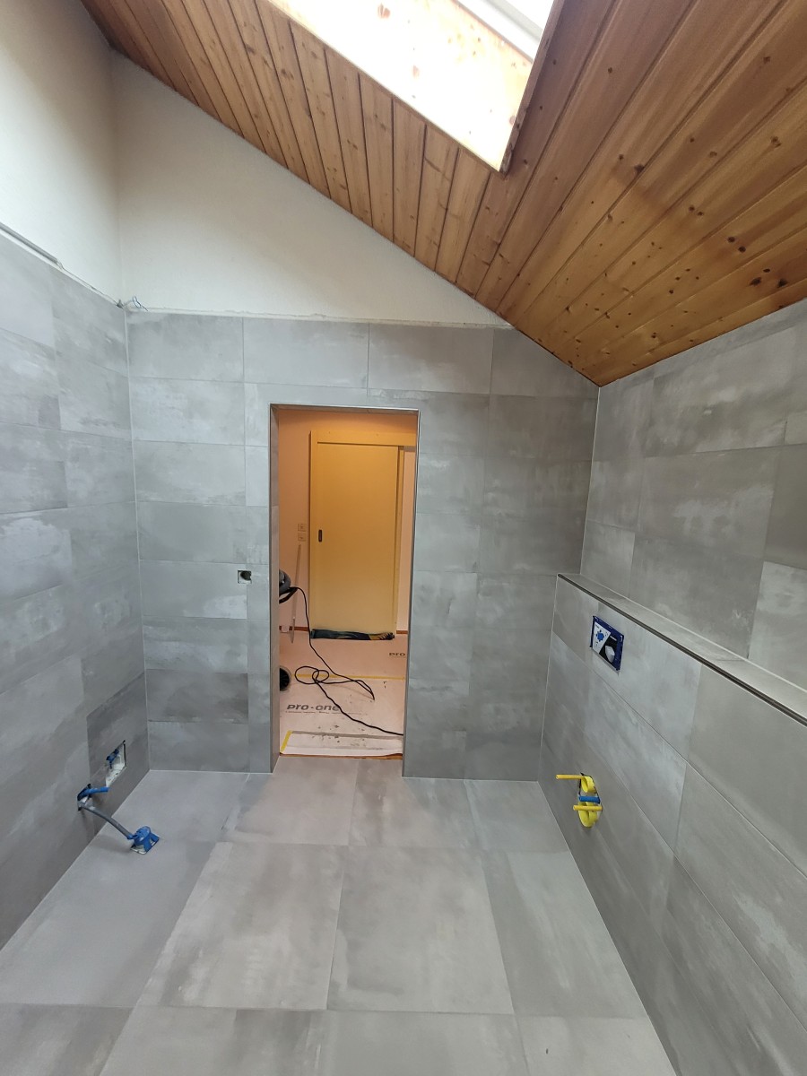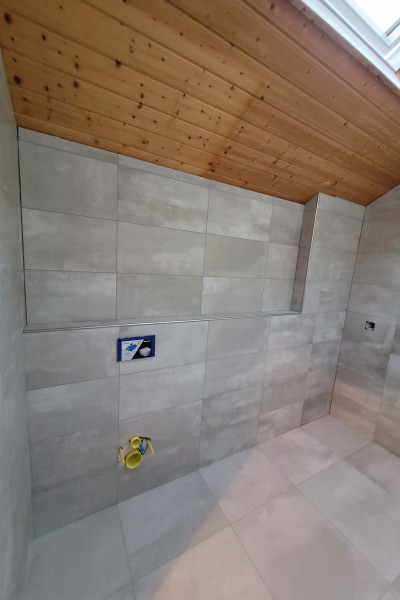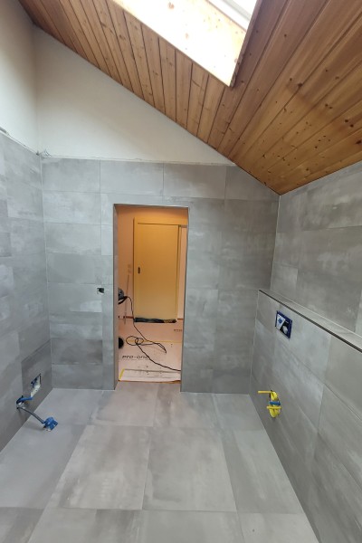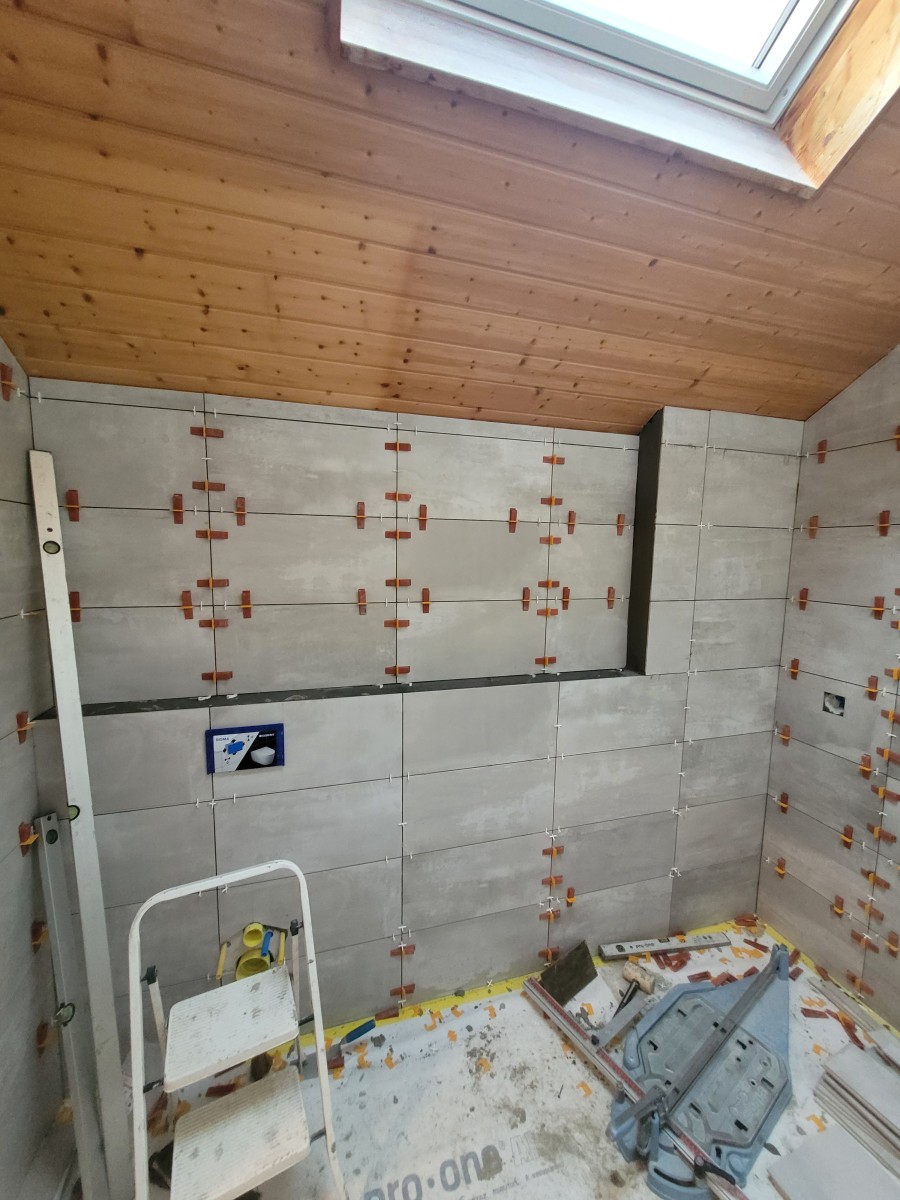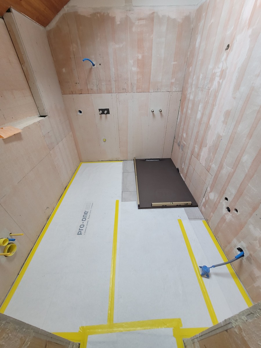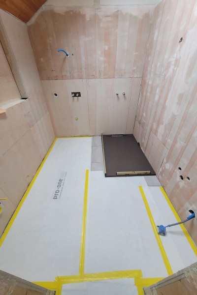 La pose du carrelage au sol de 60/60 a été réalisée, le sanitaire a pu poser le bac de douche.