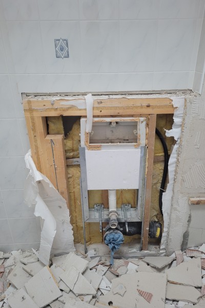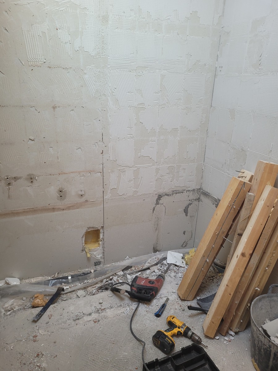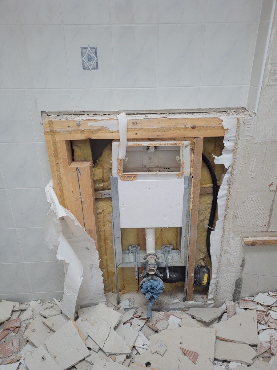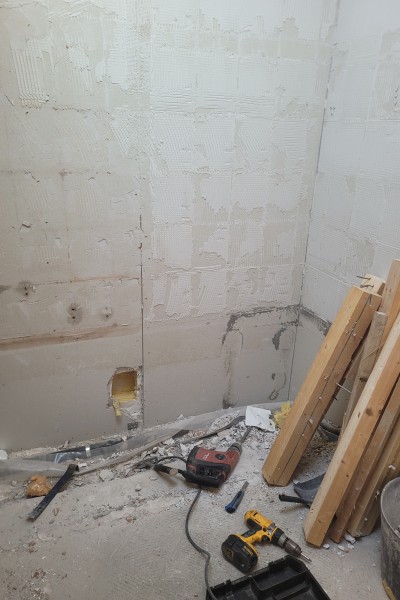 Après les sondages nous avons démoli les murs pour préparer la nouvelle mise en place de la salle de bain.