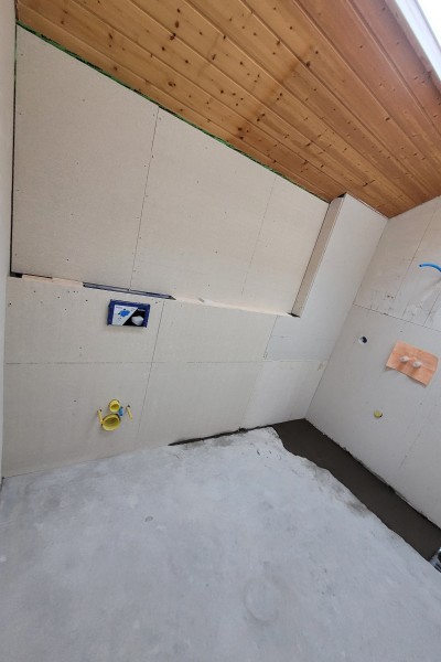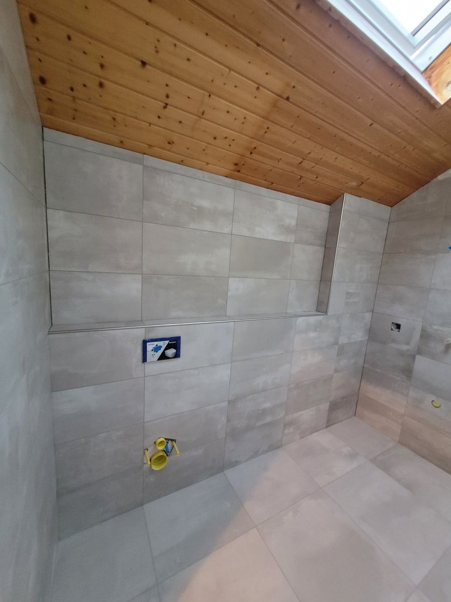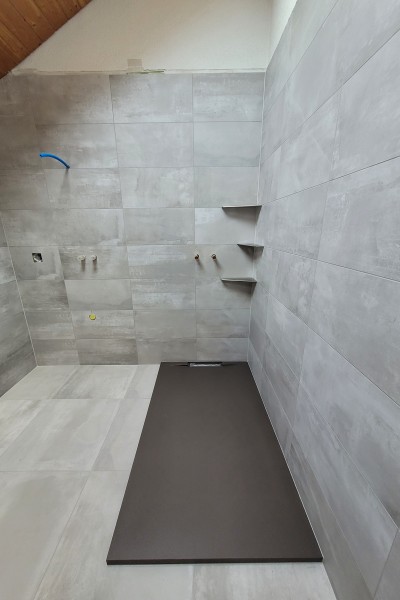 Nous pouvons appliquer nos joints sur les murs et le sol, des accessoires d’angle pour les produits de douche ont été installé, et enfin les silicones ont été appliqués.